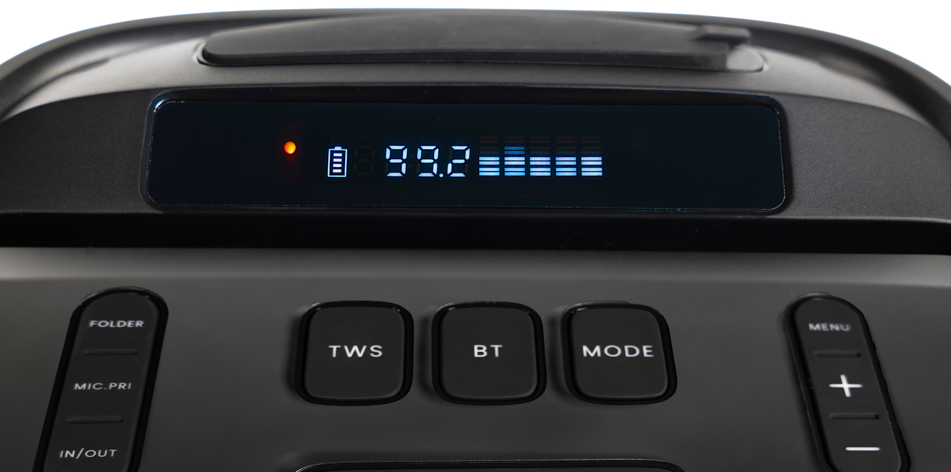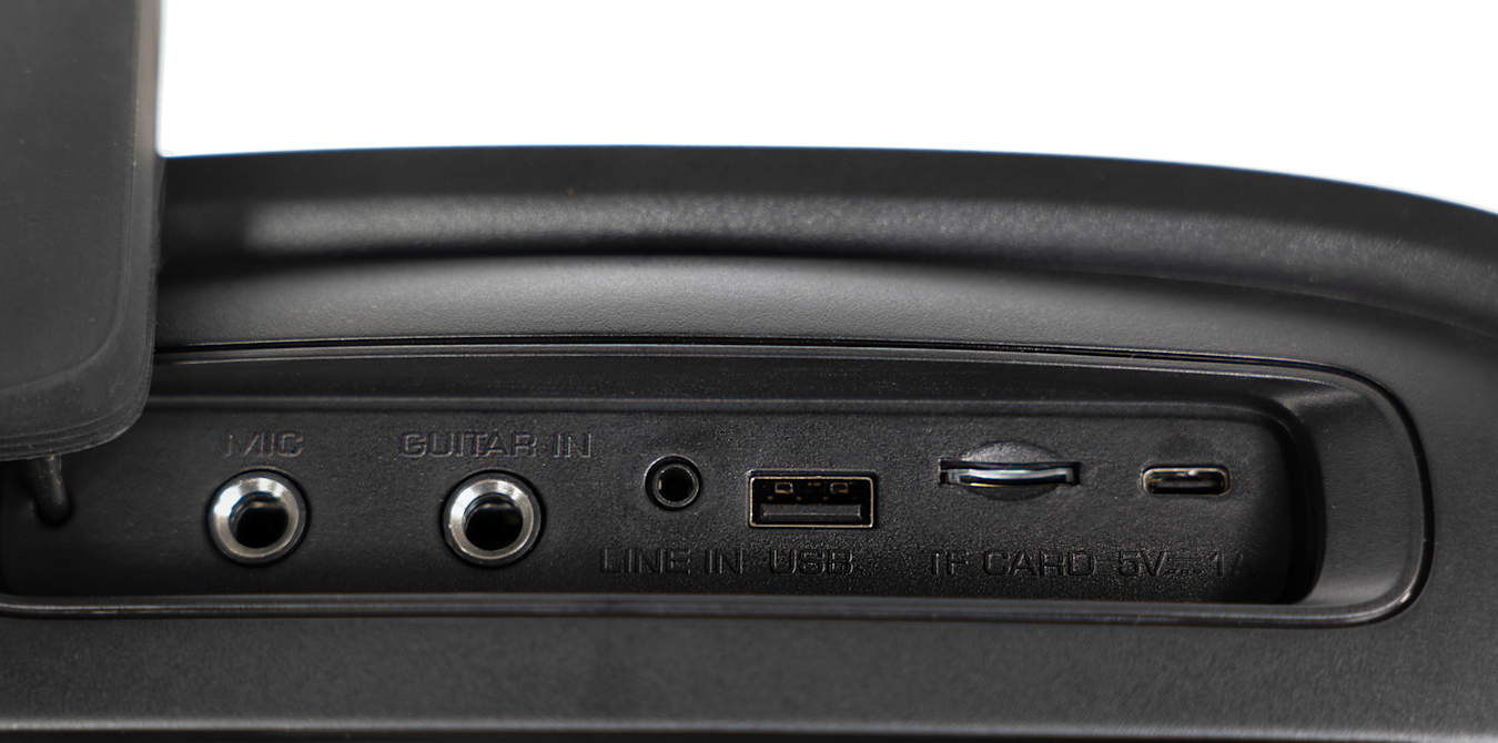 – conectivitate: Bluetooth, USB + TF Card MP3 (card max. 32 GB), LINE-IN 3.5 mm, radio digital FM PLL (87.5-108.0 MHz); 1x intrare de microfon si 1x intrare de chitara (6,35 mm)