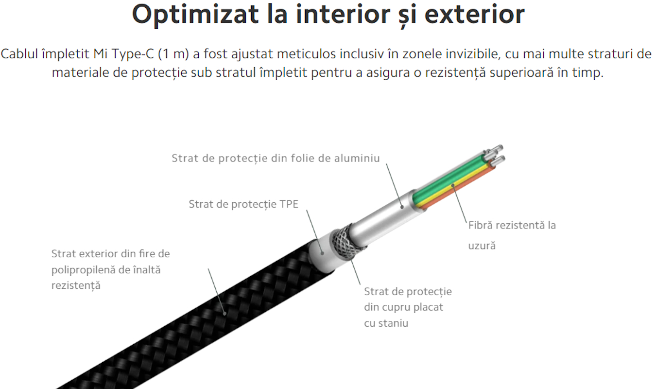 – realizat din TPE + fibra de sticla, standard YD/T 1591-2009: cablu impletit, robust si durabil; lungime: 1.0 m, greutate 40 g