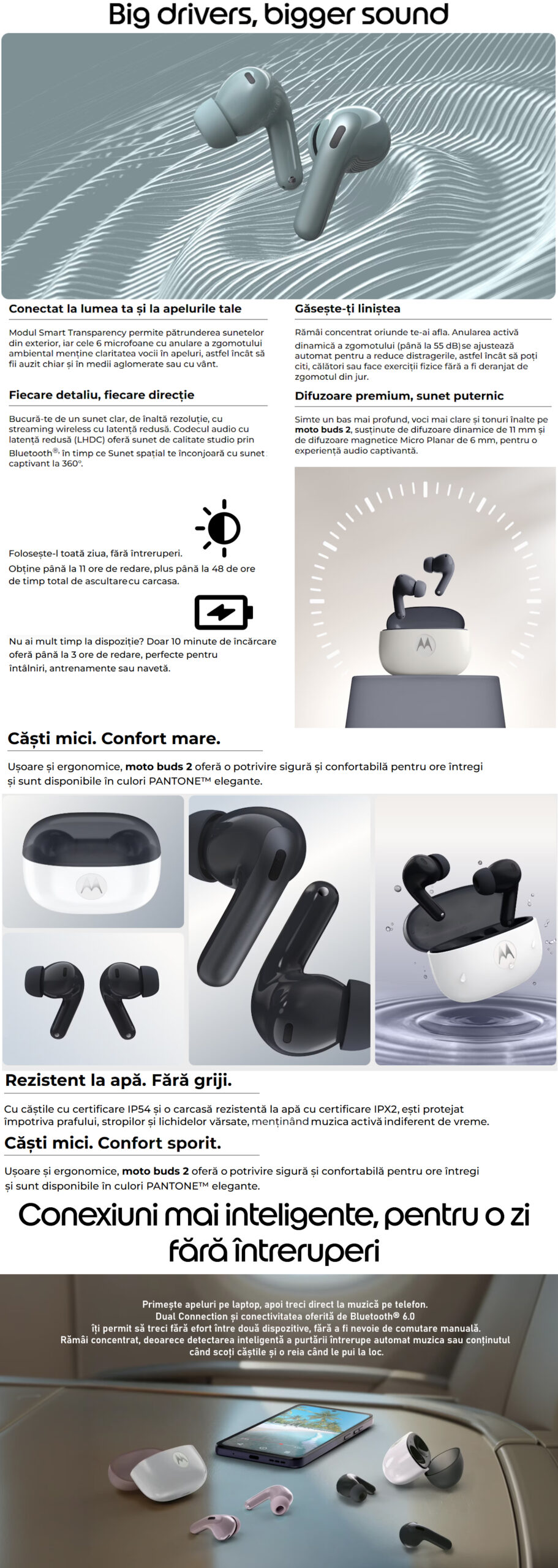 – Moto buds app: redare muzica si apeluri vocale stereo; control tactil; Dual dynamic drivers, certificare audio Hi-Res, EQ Tuning, Asistenta vocala, Fast Pair, CrystalTalk AI