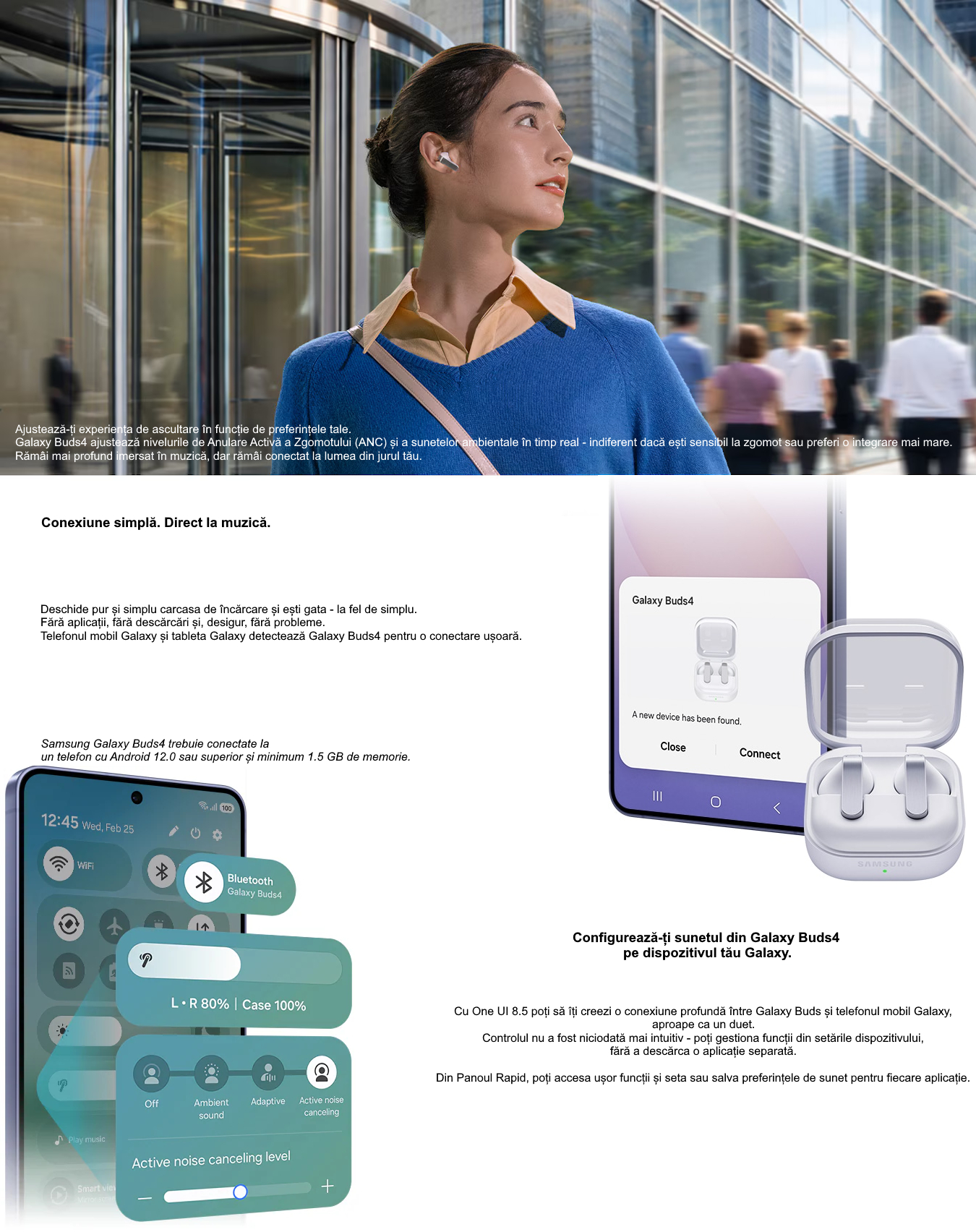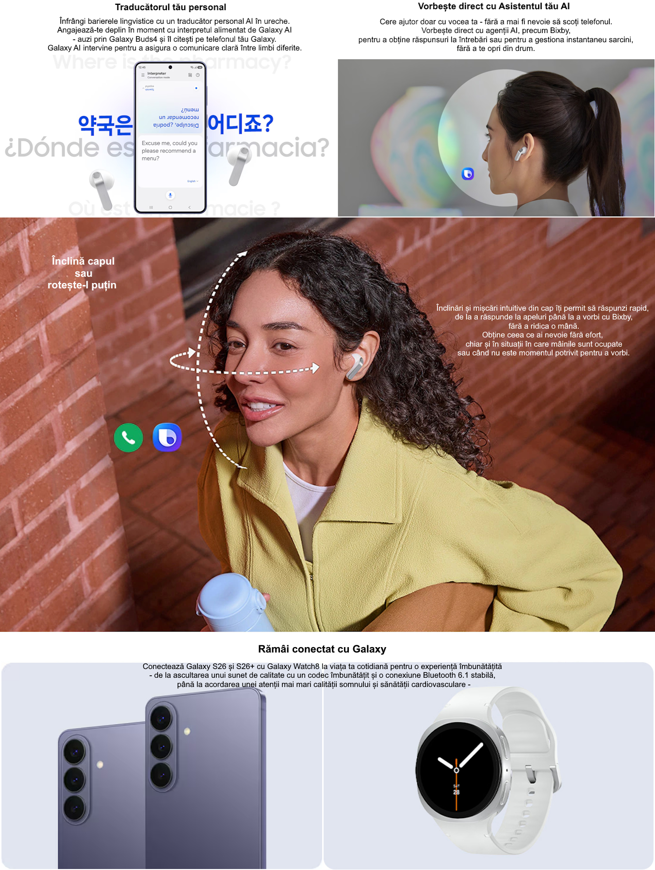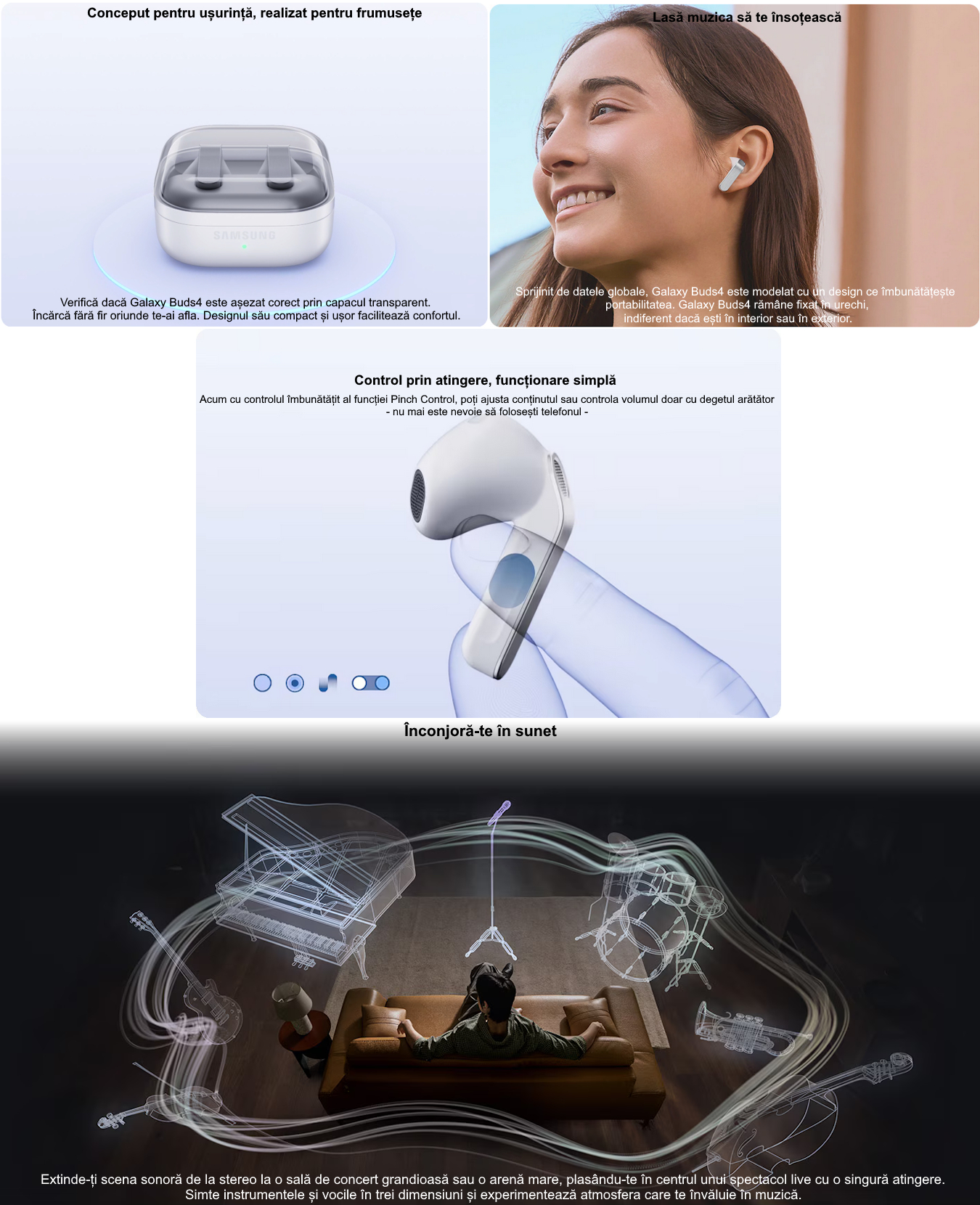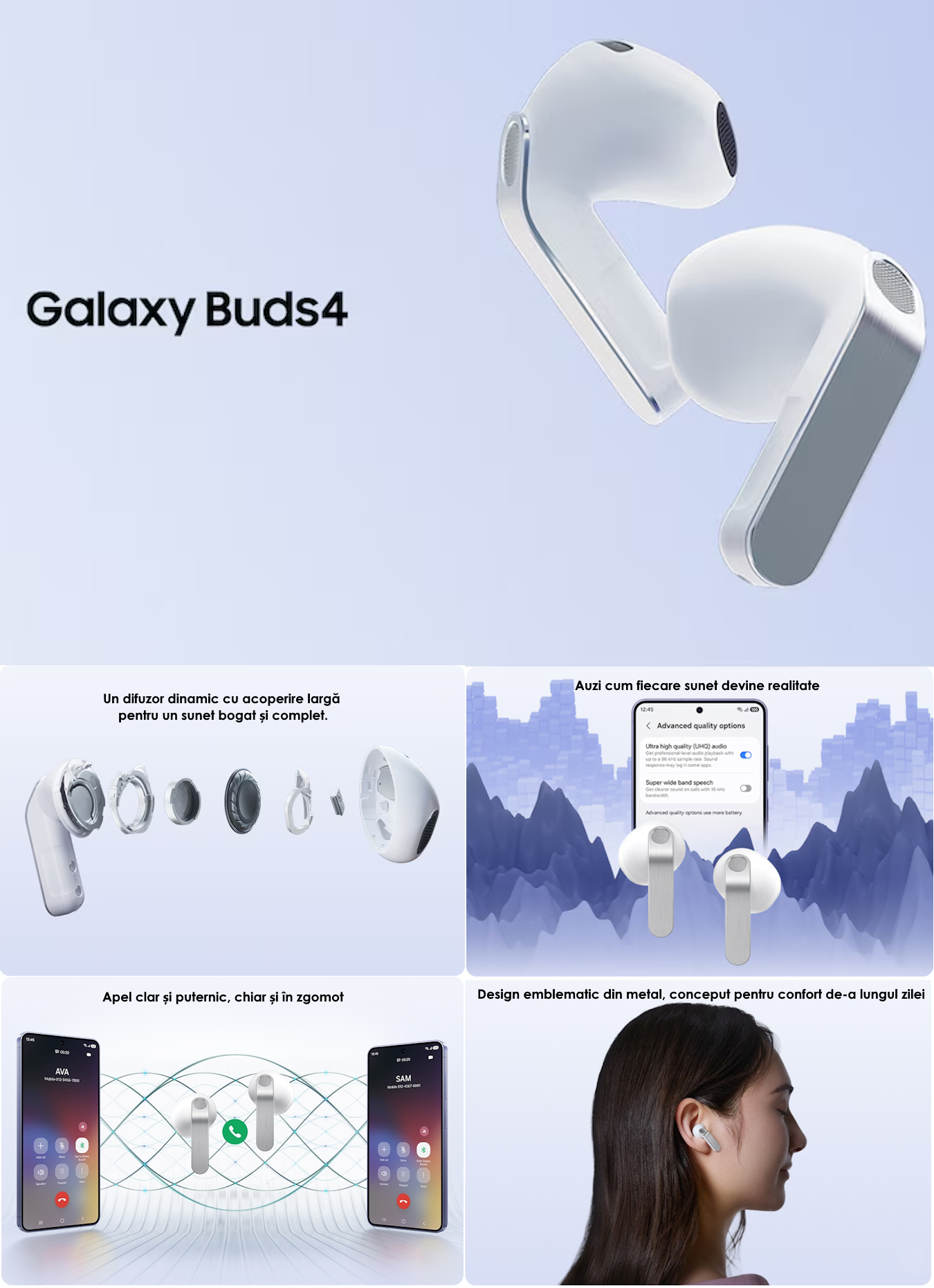 – functii: Voice Command, redare muzica, apeluri vocale stereo, asistenta vocala Bixby; comenzi AI si tactile; Buds Auto Switch, 360 Audio (Spatial Audio), Adaptive EQ/ANC, certificare audio Hi-Res, SmartThings Find; unitate de amplificare vocala; calitate avansata a apelurilor in mediu zgomot (DNN + VPU + Beamforming);