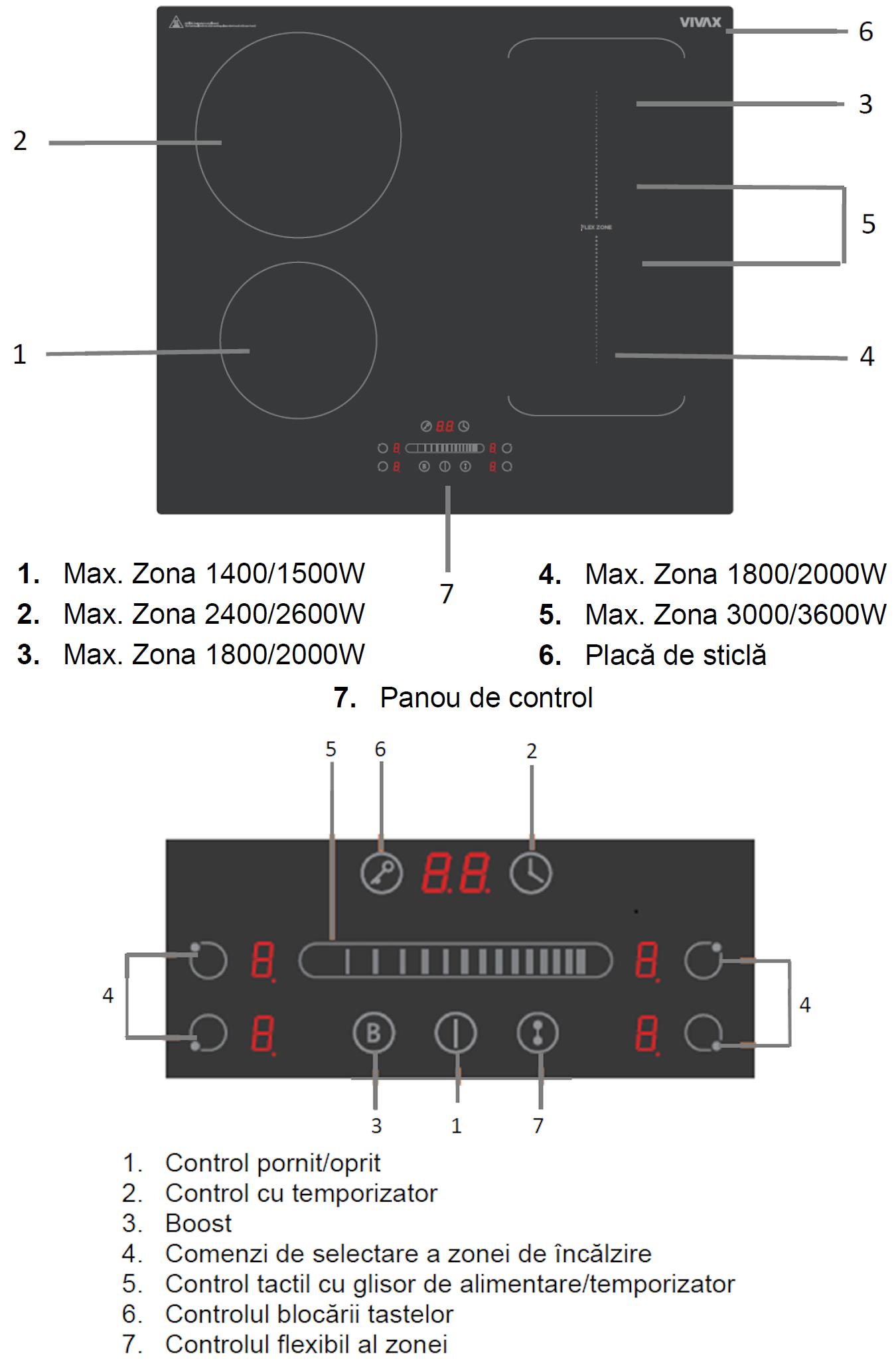 – putere (W) suprafata dreapta superioara si jos (Boost): 1800 / 2000, zona flexibila 3000/3600W si 1800 / 2000 / zona flexibila 3000/3600W