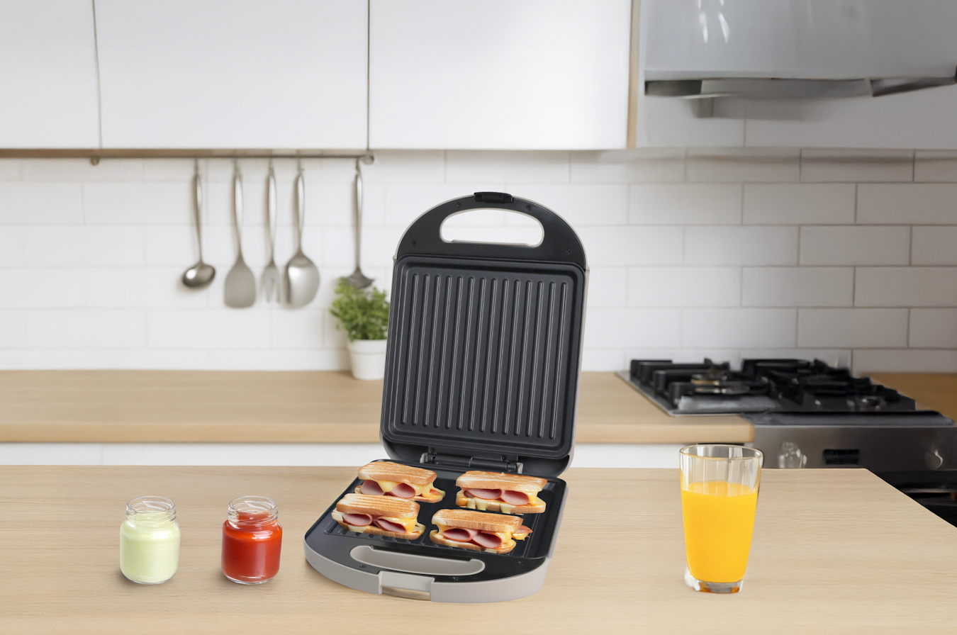Acest prăjitor de pâine practic este echipat cu o placă spațioasă pentru prepararea a 4 sandvișuri simultan, fiind ideal pentru familii sau reuniuni. Datorită stratului antiaderent, curățarea este rapidă și ușoară. Mânerul izolat și clema de blocare asigură o utilizare sigură, în timp ce luminile indicatoare te informează clar când dispozitivul este gata de funcționare.