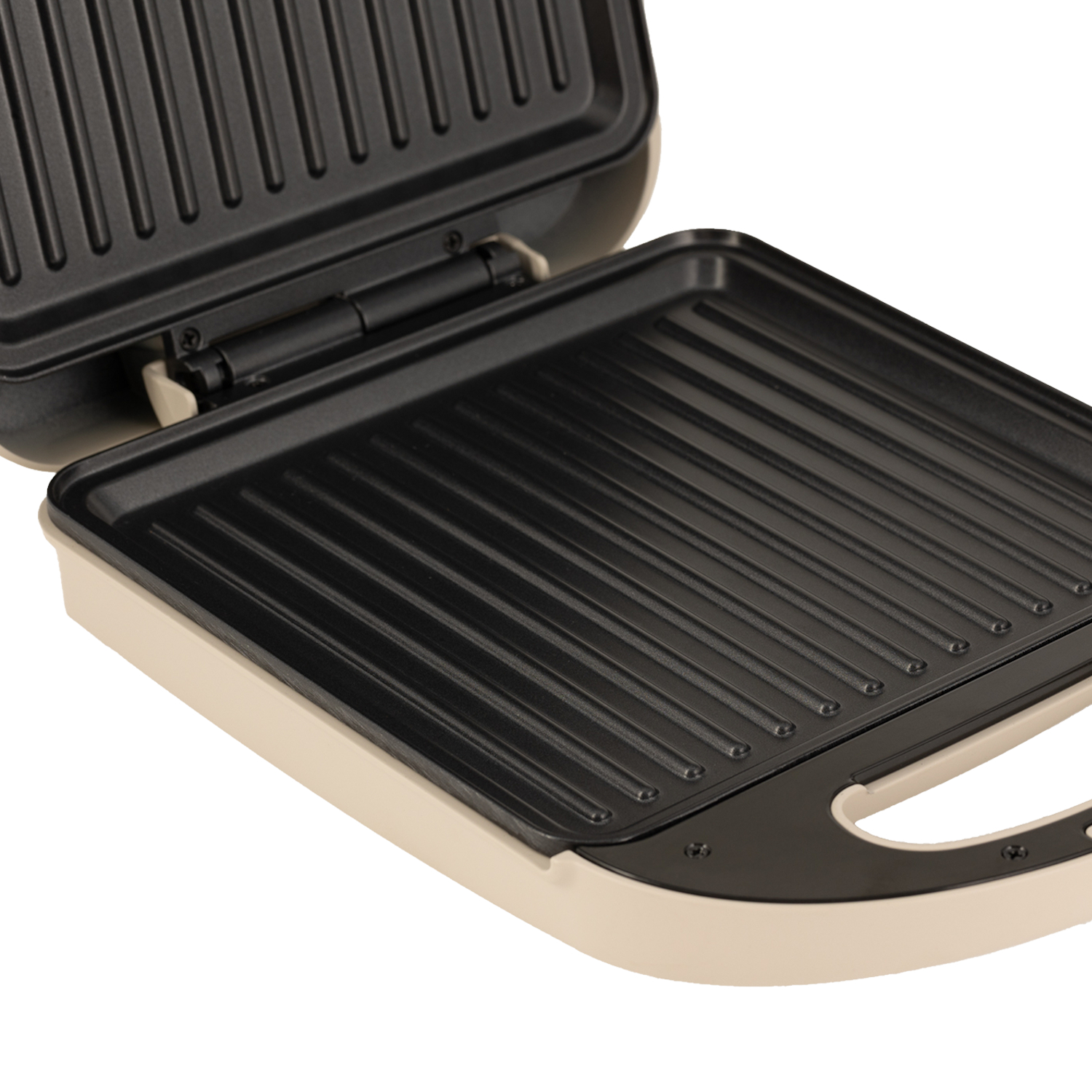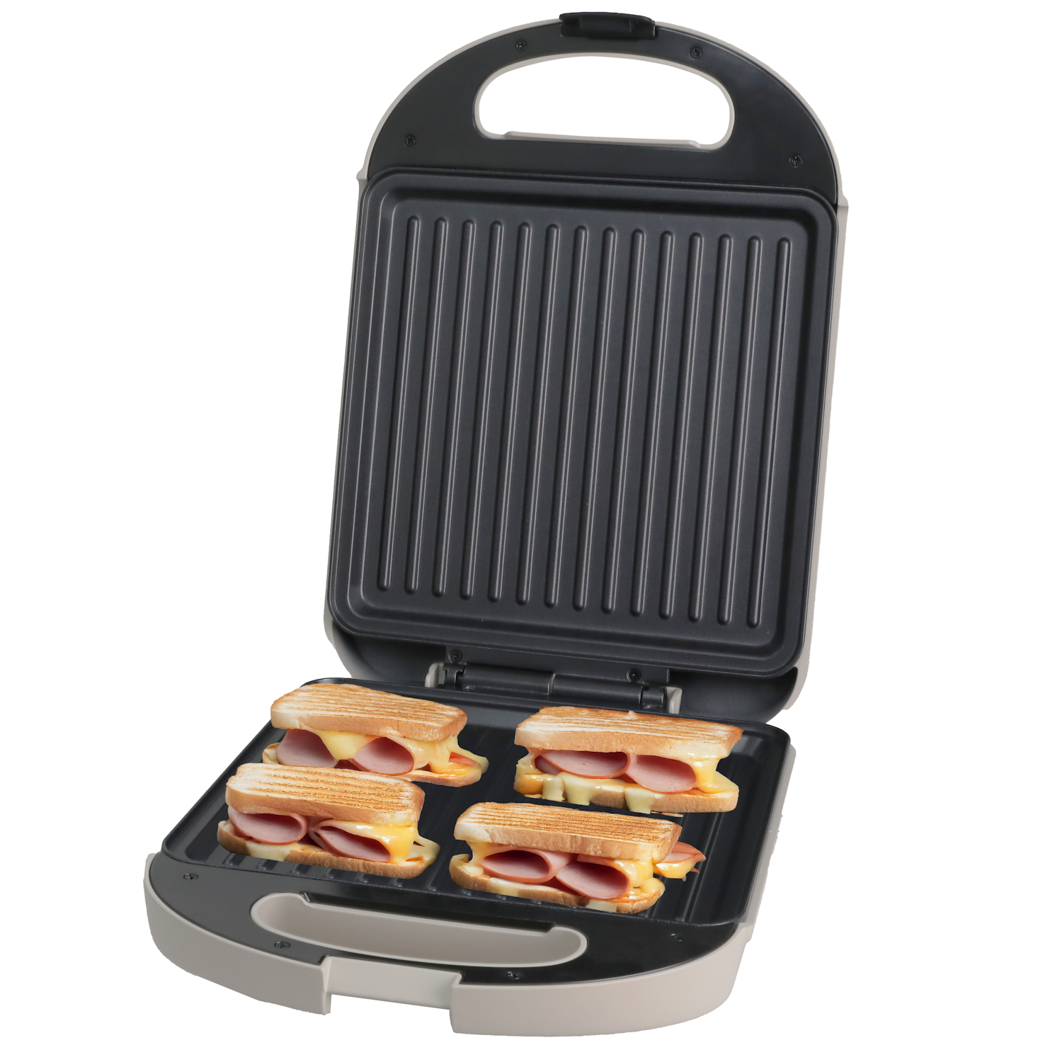 Acest prăjitor de pâine practic este echipat cu o placă spațioasă pentru prepararea a 4 sandvișuri simultan, fiind ideal pentru familii sau reuniuni. Datorită stratului antiaderent, curățarea este rapidă și ușoară. Mânerul izolat și clema de blocare asigură o utilizare sigură, în timp ce luminile indicatoare te informează clar când dispozitivul este gata de funcționare.