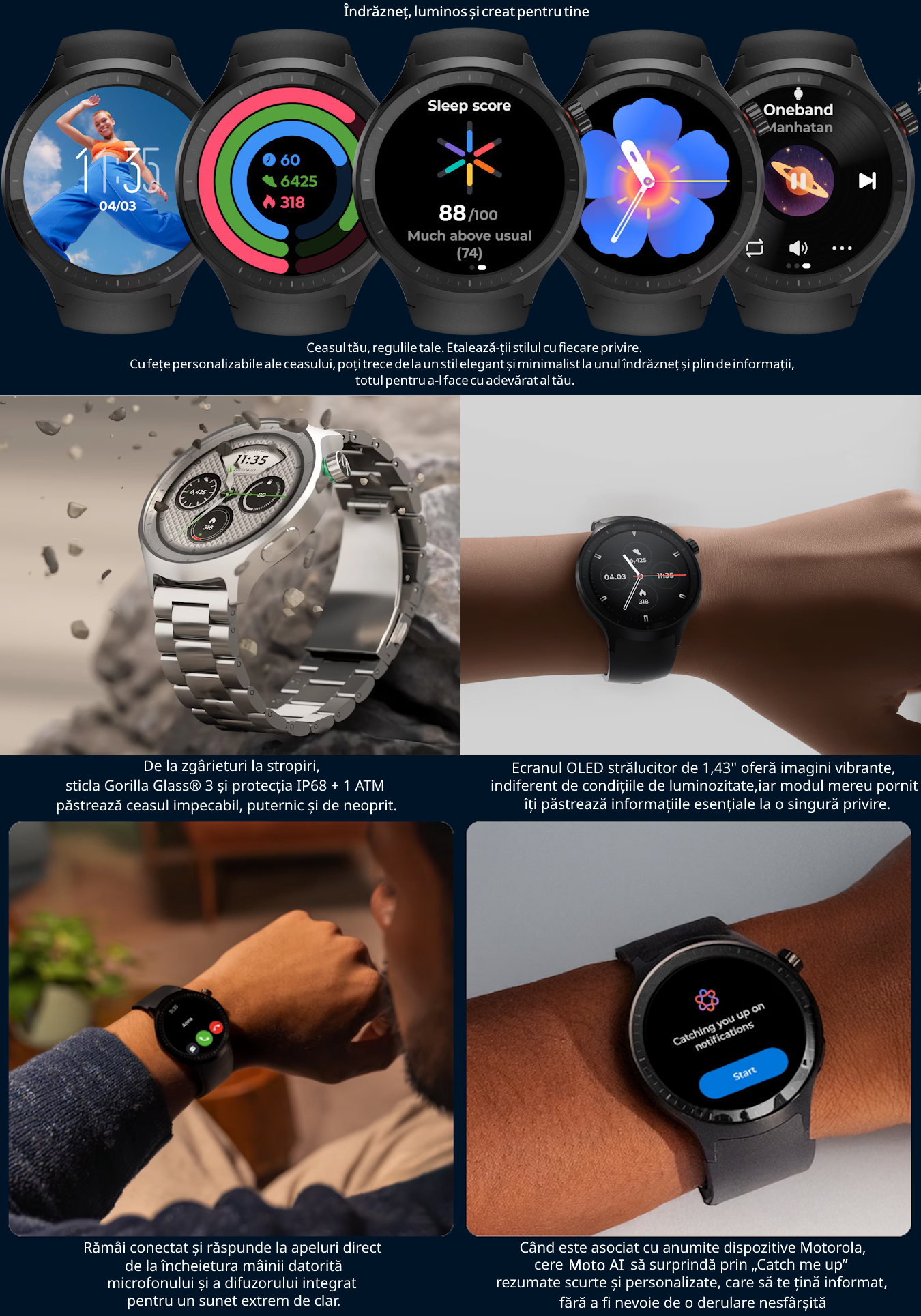 – display digital OLED 1.43″ – rezolutie 464 x 464 (~317 ppi ); stil circular; protectie ecran Gorilla Glass 3; functie Always-on Display