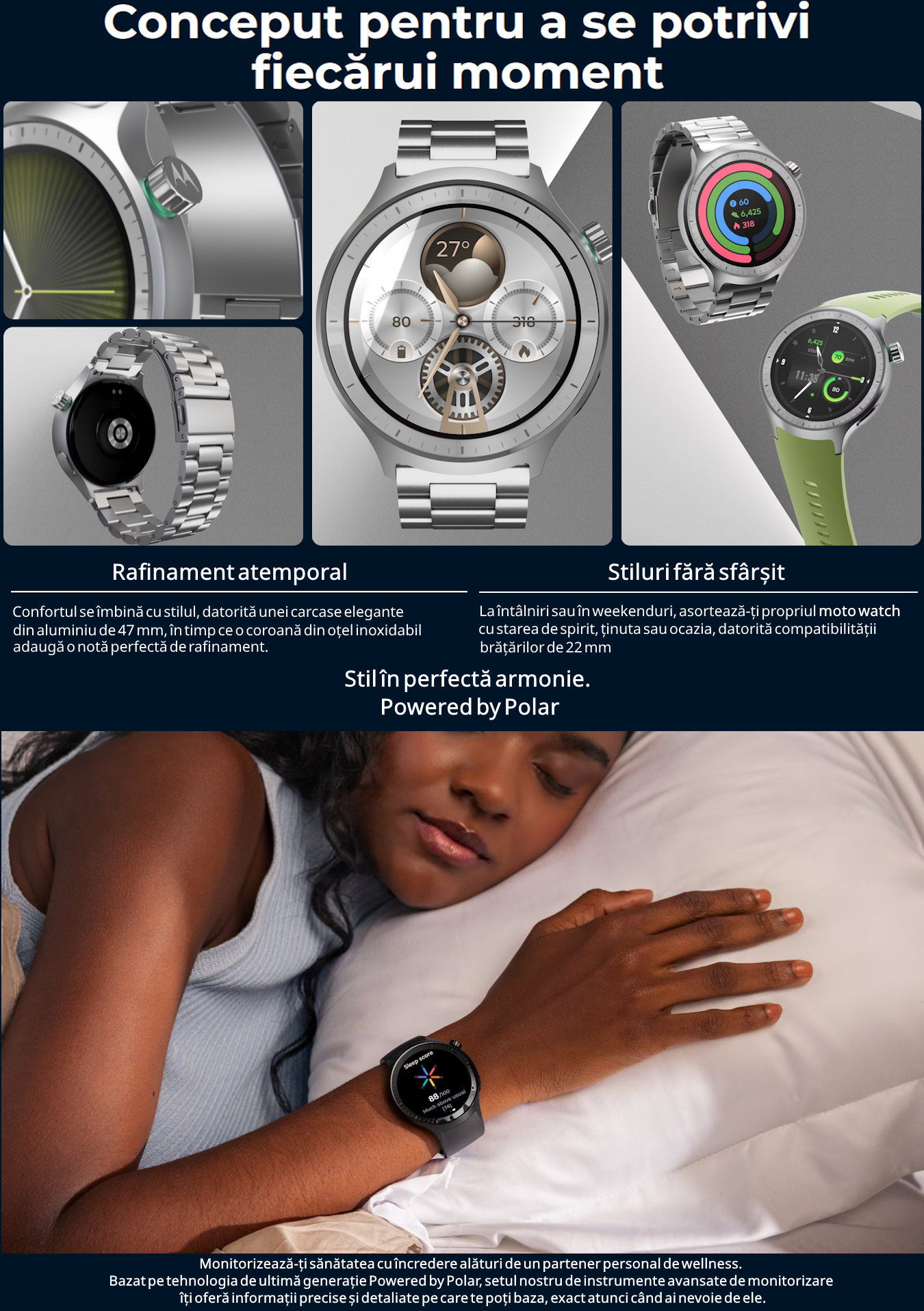 – realizat cu tehnologie Polar: statistici de fitness si notificari, +100 de moduri sportive, rezistenta la apa, control muzica