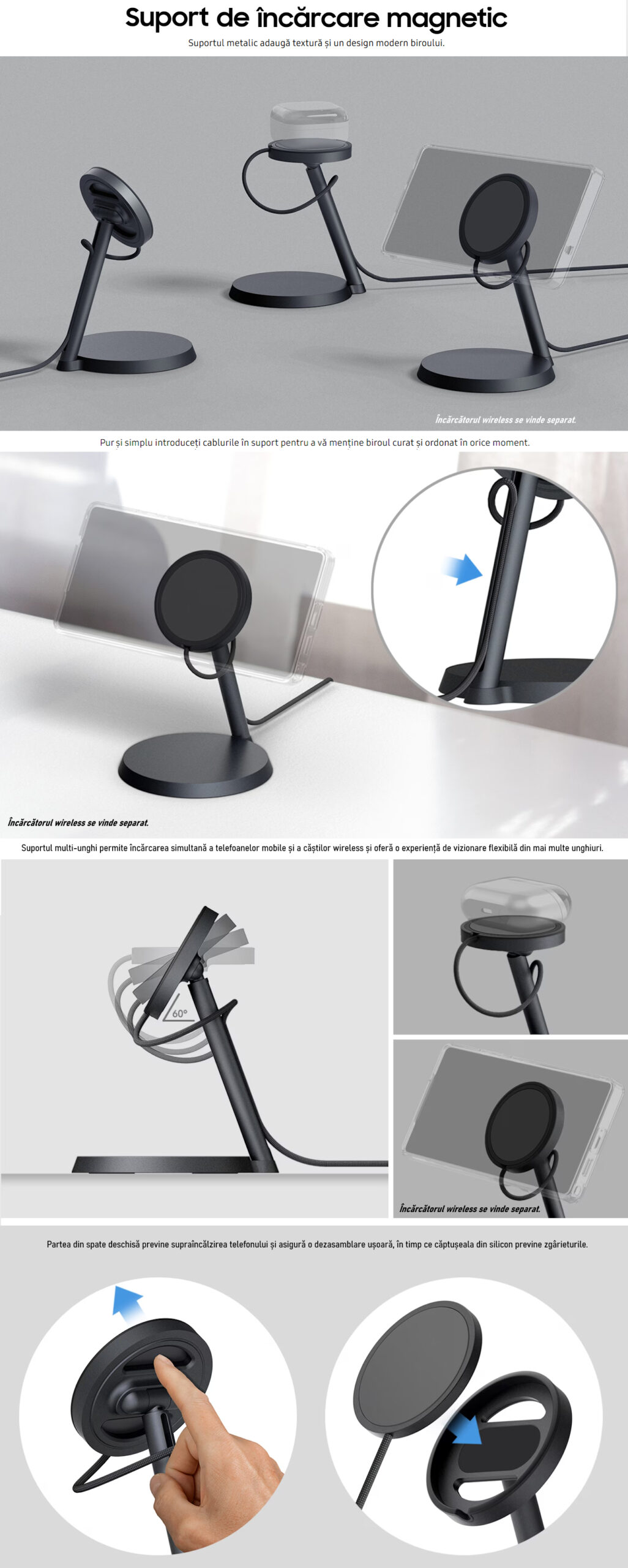 – suportul multi-unghi permite incarcarea simultana a telefoanelor mobile si a castilor wireless