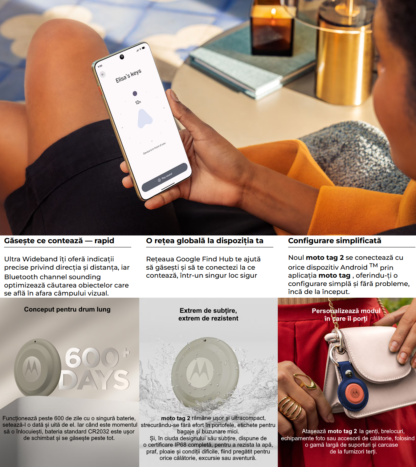 – functii: functia inteligenta de notificare si localizare prin reteaua Find my device de la Google, Shutter Button, certificat sa indeplineasca cerintele pentru accesoriile Google Find Hub, criptare end-to-end, notificari